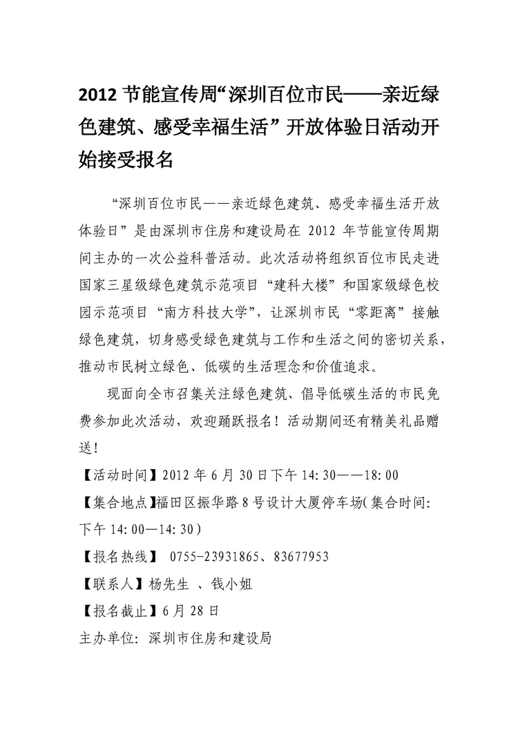 2012节能宣传周“深圳百位市民——亲近绿色建筑、感受幸福生活”开放体验日活动开始接受报名