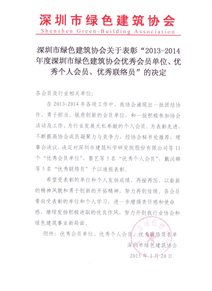 关于表彰“2013-2014年度深圳市绿色建筑协会优秀会员单位、优秀个人会员、优秀联络员”的决定