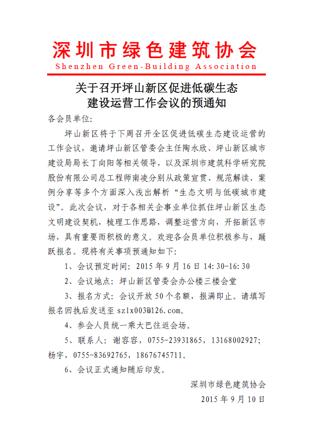 关于召开坪山新区促进低碳生态建设运营工作会议的预通知