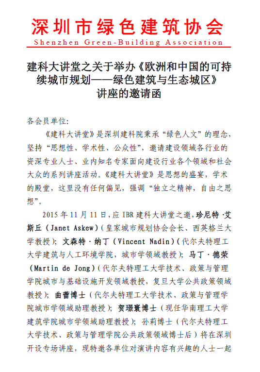 建科大讲堂之关于举办《欧洲和中国的可持续城市规划——绿色建筑与生态城区》讲座的邀请函