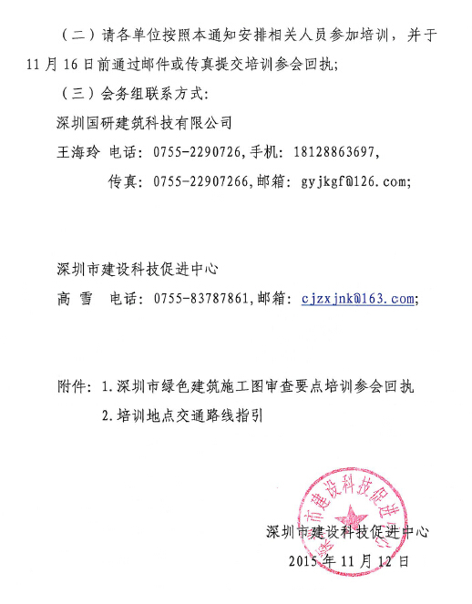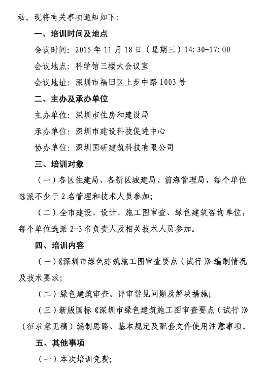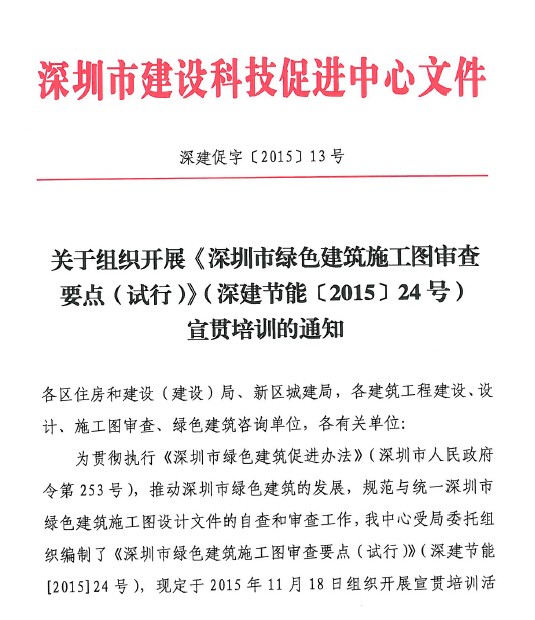 转:关于组织开展《深圳市绿色建筑施工图审查要点(试行)》(深建节能[2015]24号)宣贯培训的通知