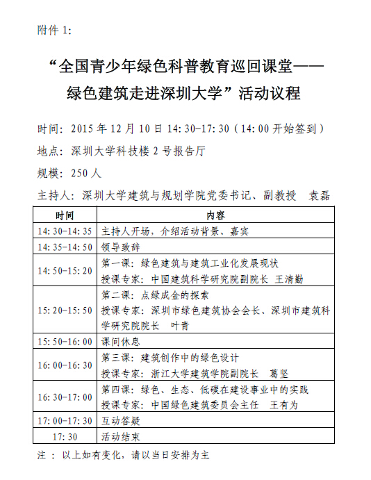 关于举办“全国青少年绿色科普教育巡回课堂-绿色建筑走进深圳大学”的正式通知