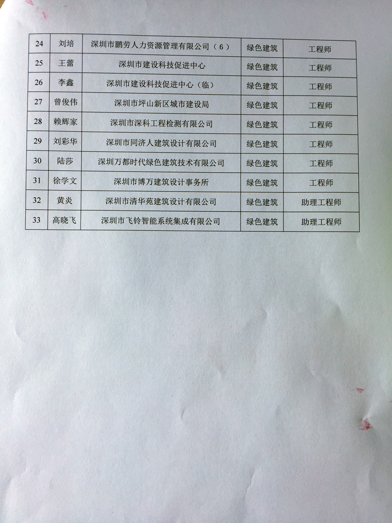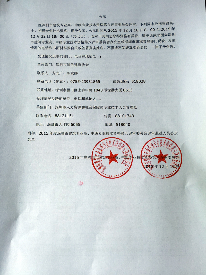 “2015年度深圳市绿色建筑专业高、中级专业技术资格评审”评后公示