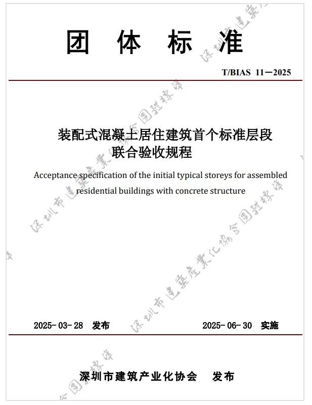 2025年3月28日,由招商蛇口、深圳天华及深圳建筑产业化协会联合主编的团体标准《装配式混凝土居住建筑首个标准层段联合验收规程》T/BIAS 11-2025(以下简称《规程》)正式发布,自2025年6月30日起实施!标志着这一项技术管理标准的编制工作圆满完成。这项标准的实施,将为提高我市装配式建筑项目管理水平,提升我市装配式建筑的质量品质而起到积极的作用。