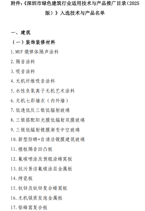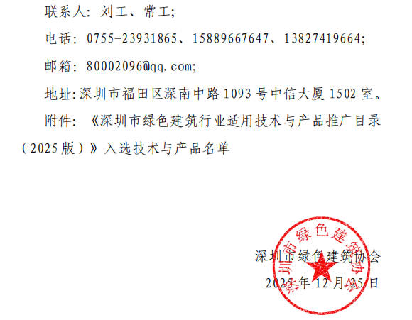 《深圳市绿色建筑行业适用技术与产品推广目录(2025 版)》入选技术与产品名单公告暨产品技术宣传彩页的征集通知