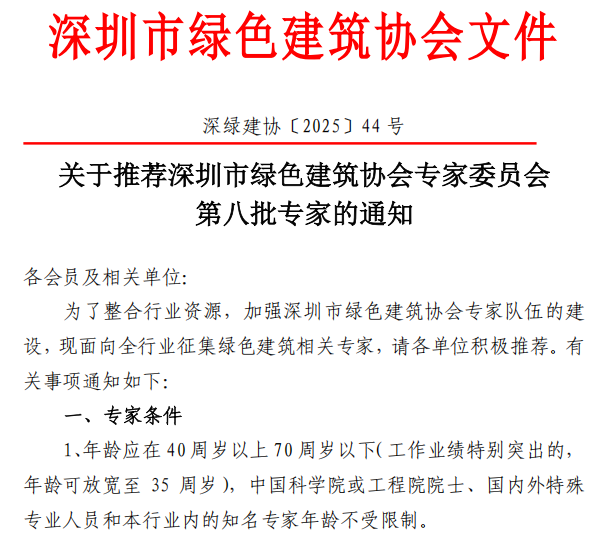 2025年,为整合行业资源,加强协会专家委员会队伍建设,协会发布《关于推荐深圳市绿色建筑协会专家委员会第八批专家的通知》及《关于推荐深圳市绿色建筑协会专家委员会青年学组第二批青年成员的通知》。截止目前,协会专家委员会共拥有正、副高级工程师超过400名,青年学组成员近50名,成为协会开展标准编制、课题研究、标识评价、职称评审、技术论证等专业技术服务工作的核心力量。