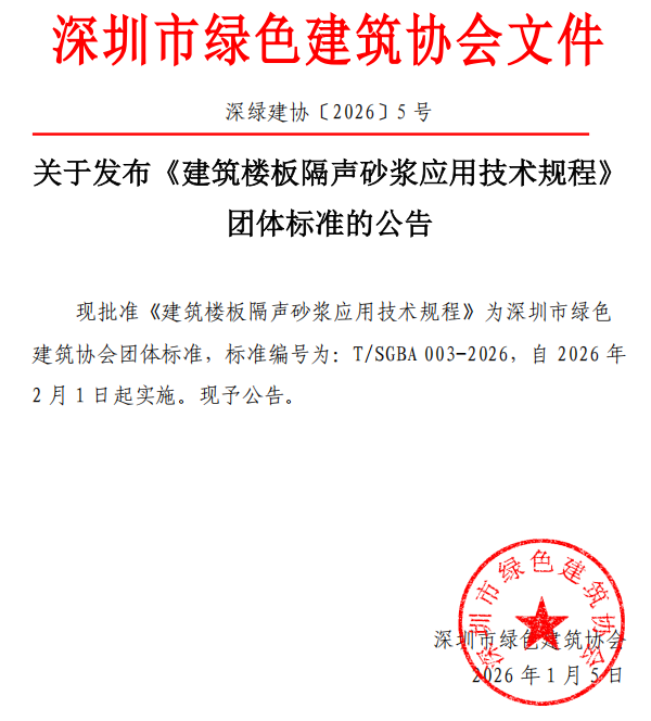 关于发布《建筑楼板隔声砂浆应用技术规程》团体标准的公告