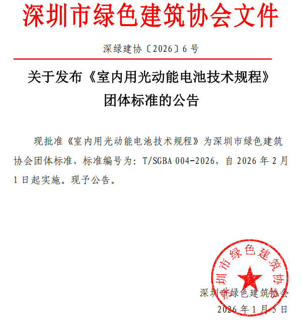 关于发布《室内用光动能电池技术规程》团体标准的公告