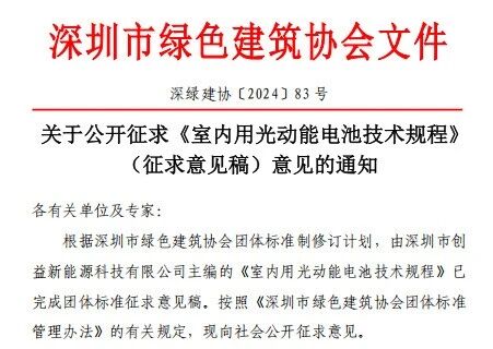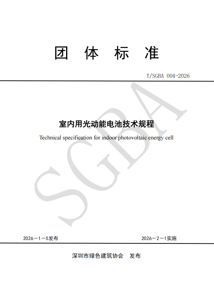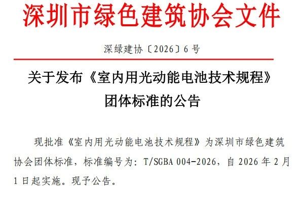 2026年1月5日,深圳市绿色建筑协会团体标准《室内用光动能电池技术规程》(简称《标准》)发布,并于2026年2月1日起正式实施。
