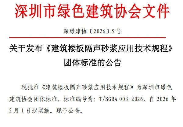 2026年1月5日,深圳市绿色建筑协会团体标准《建筑楼板隔声砂浆应用技术规程》(简称《标准》)发布,并于2026年2月1日起正式实施。