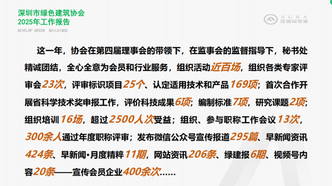 协会在第四届理事会的带领下,在监事会的监督指导下,秘书处精诚团结,全心全意为会员和行业服务,2025年组织展会、论坛、会员交流等活动近百场。这一年,协会心系会员,建立并完善会员需求响应机制,持续提升会员满意度,与会员风雨同行;协会努力提升服务能力,积极拓展项目标识评价范畴,推动国际资质互认;协会观新业态,聚焦建筑能源结构优化、绿色建材供应链升级、数智运营与数据资产等重点领域,谋篇布局,探索出路。协会不断创新服务理念,在服务中彰显担当,在创新中提升价值,为推动绿色建筑行业转型升级注入强劲动能,在助力企业破局中实现新作为、展现新气象、打开新格局。