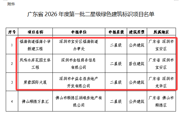 《通知》指出,根据《住房和城乡建设部关于印发绿色建筑标识管理办法的通知》(建标规〔2021〕1号)和《广东省住房和城乡建设厅关于我省绿色建筑标识申报等相关工作的通知》要求,广东省住房和建设厅组织完成了2026年度第一批二星级绿色建筑标识项目的审查工作,确定4个项目获得二星级绿色建筑标识。现将项目名单予以公布。其中,包含福海街道福海小学新建工程、凤鸣水岸花园主体工程、莱蒙国际大厦等三个深圳项目。