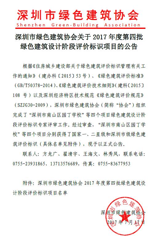 关于2017年度第四批绿色建筑设计阶段评价标识项目的公告