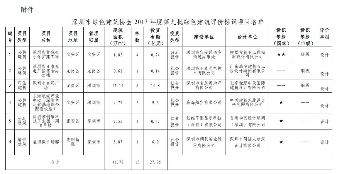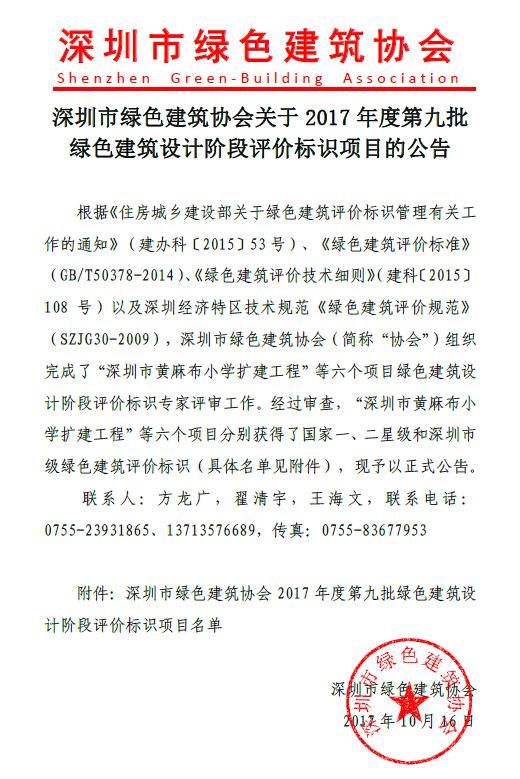 关于2017年度第九批绿色建筑设计阶段评价标识项目的公告