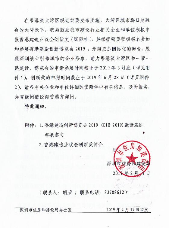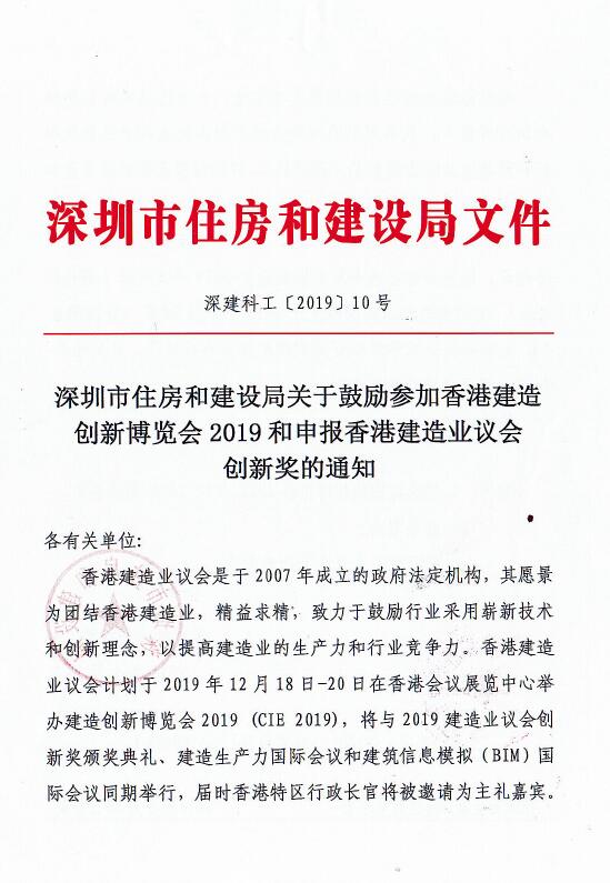 转:深圳市住房和建设局关于鼓励参加香港建造创新博览会2019和申报香港建造业议会创新奖的通知