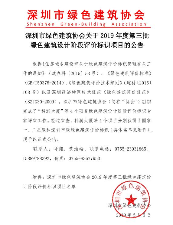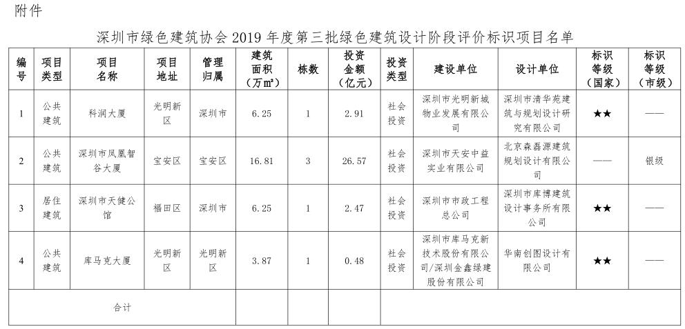 深圳市绿色建筑协会关于2019年度第三批绿色建筑评价标识项目的公告