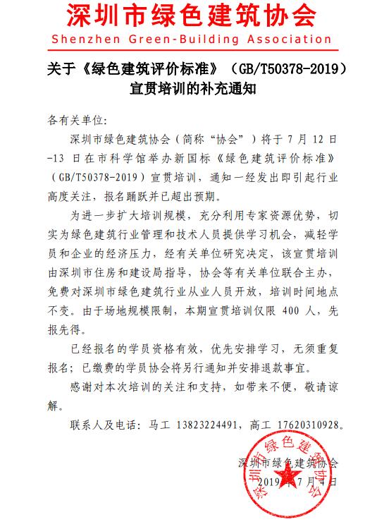 关于《绿色建筑评价标准》(GB/T 50378-2019)宣贯培训的补充通知