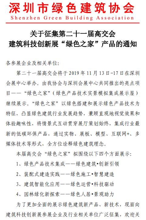 关于征集第二十一届高交会建筑科技创新展“绿色之家”产品的通知