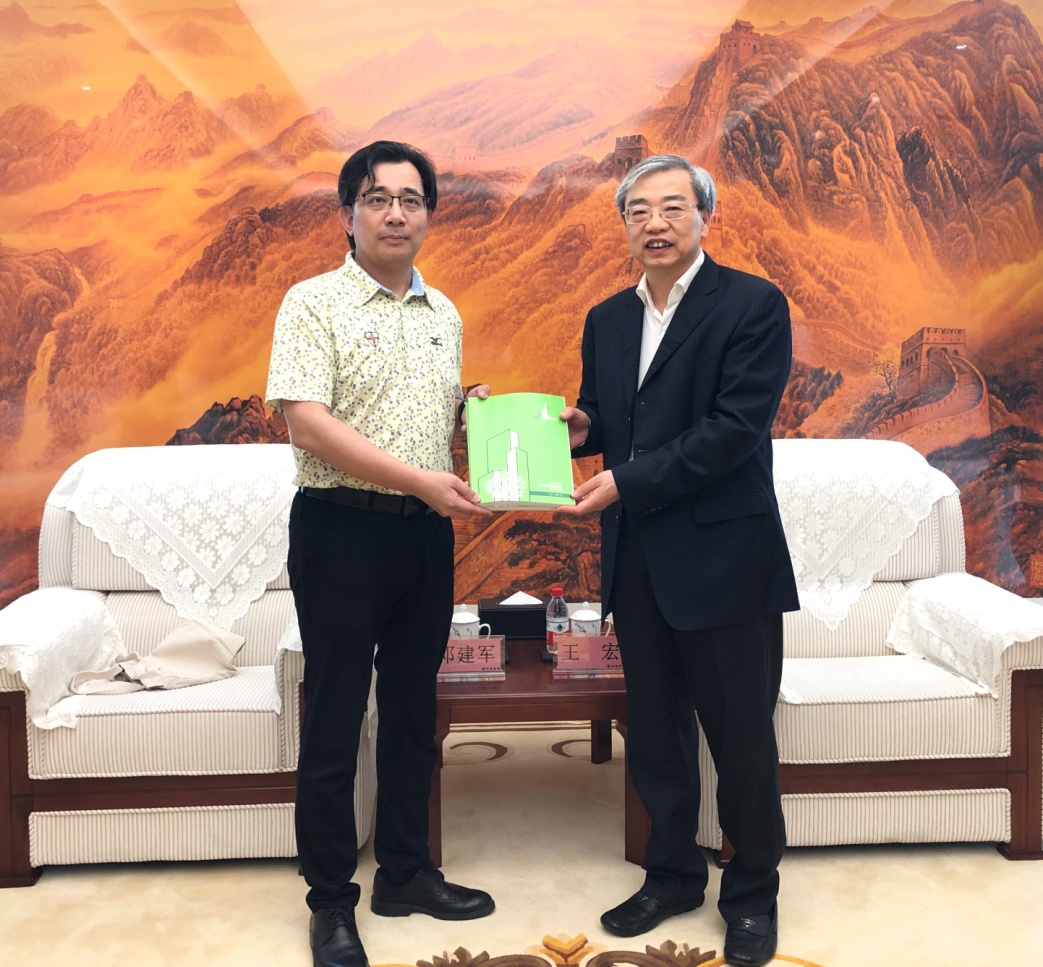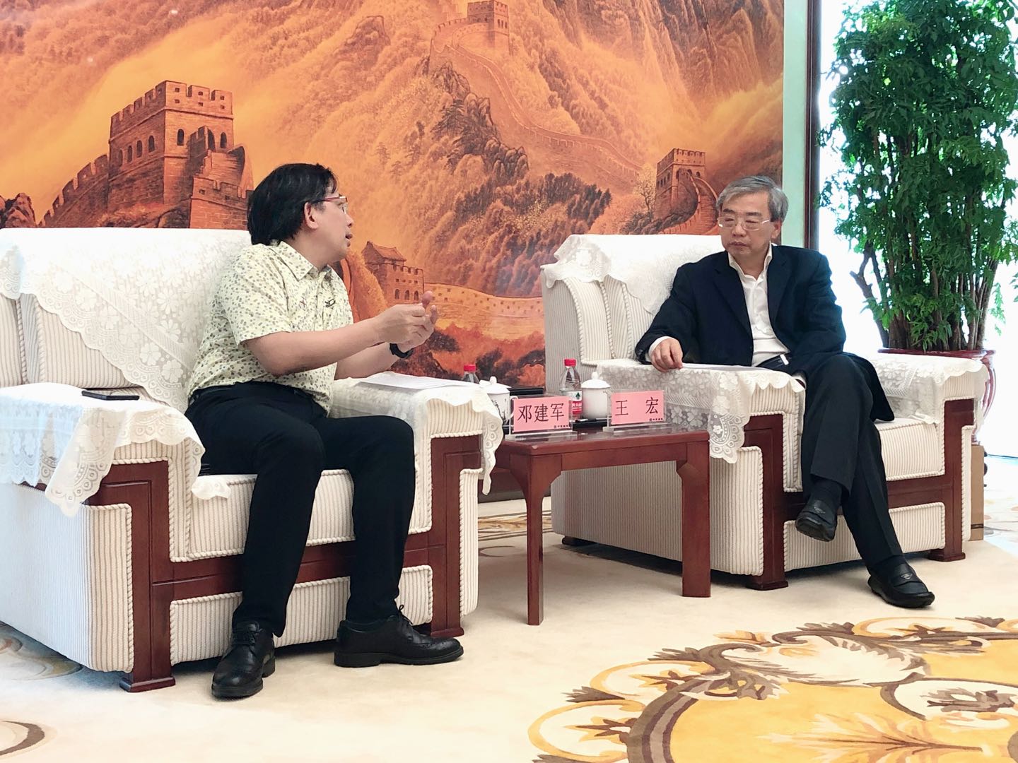 4月24日,我协会王宏会长(右)在中建钢构大厦与东莞市绿色建筑协会邓建军会长进行交流