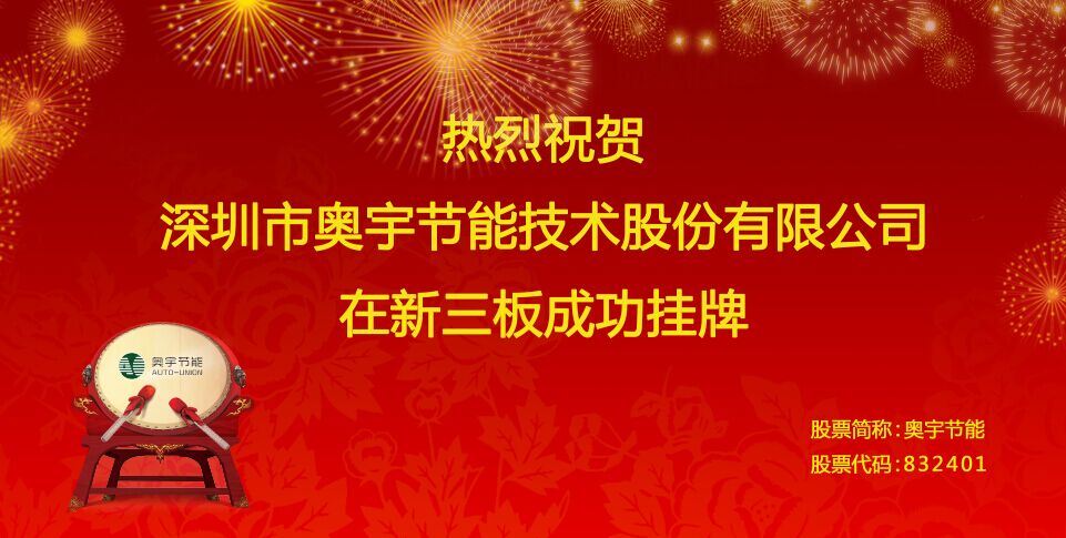 5月5日上午,深圳市奥宇节能技术股份有限公司在全国中小企业股份转让系统(简称:新三板)成功挂牌(证券简称:奥宇节能;股票代码: 832401)。奥宇节能的正式挂牌,为公司进一步发展注入了新的活力,是奥宇节能发展历程中的一个重要里程碑。