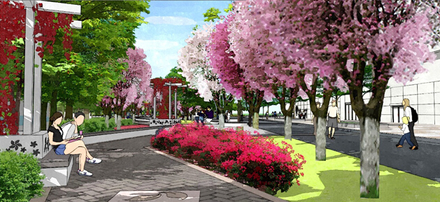 项目以香港市花紫荆花和深圳市花勒杜鹃为设计灵感,种植一条以两地市花为主的缤纷花带,贯穿于整个场地,形成一条软化的红色纽带;设计一条铭刻深港重要事件的双花游园步道连通场地,加入两地市花演化的设计元素,形成一条具象的红色纽带,突出 “连接深港纽带”的历史文化主题,传播两地特色文化,促进文化交流和社会可持续发展。