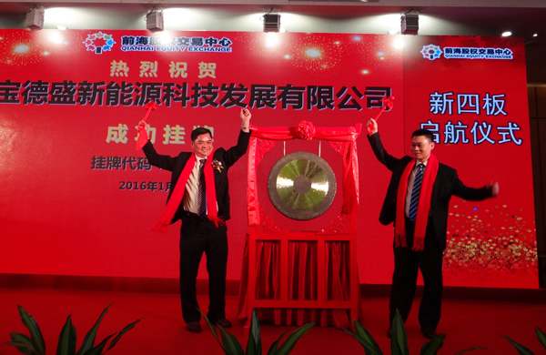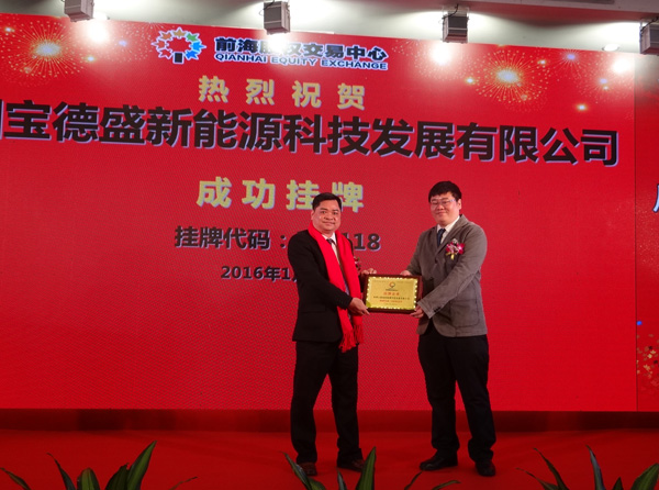 2016年1月18日,前海股权交易中心在深圳五洲宾馆举行新四板启航仪式。深圳市绿色建筑协会理事单位——深圳宝德盛新能源科技发展有限公司(以下简称“宝德盛”)在新四板挂牌。宝德盛总经理余立培(左)接受前海股权交易中心的授牌。