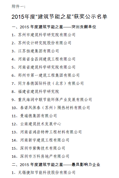 一、2015年度建筑节能之星——突出贡献单位