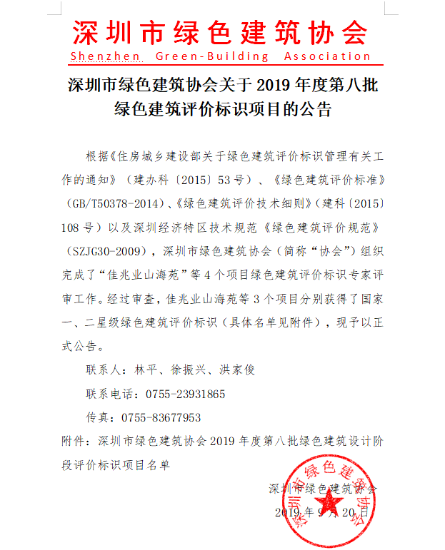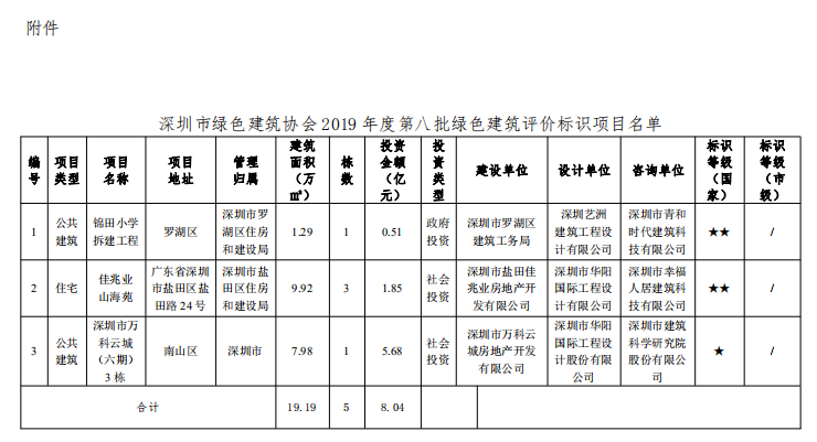 深圳市绿色建筑协会关于2019年度第八批绿色建筑评价标识项目的公告