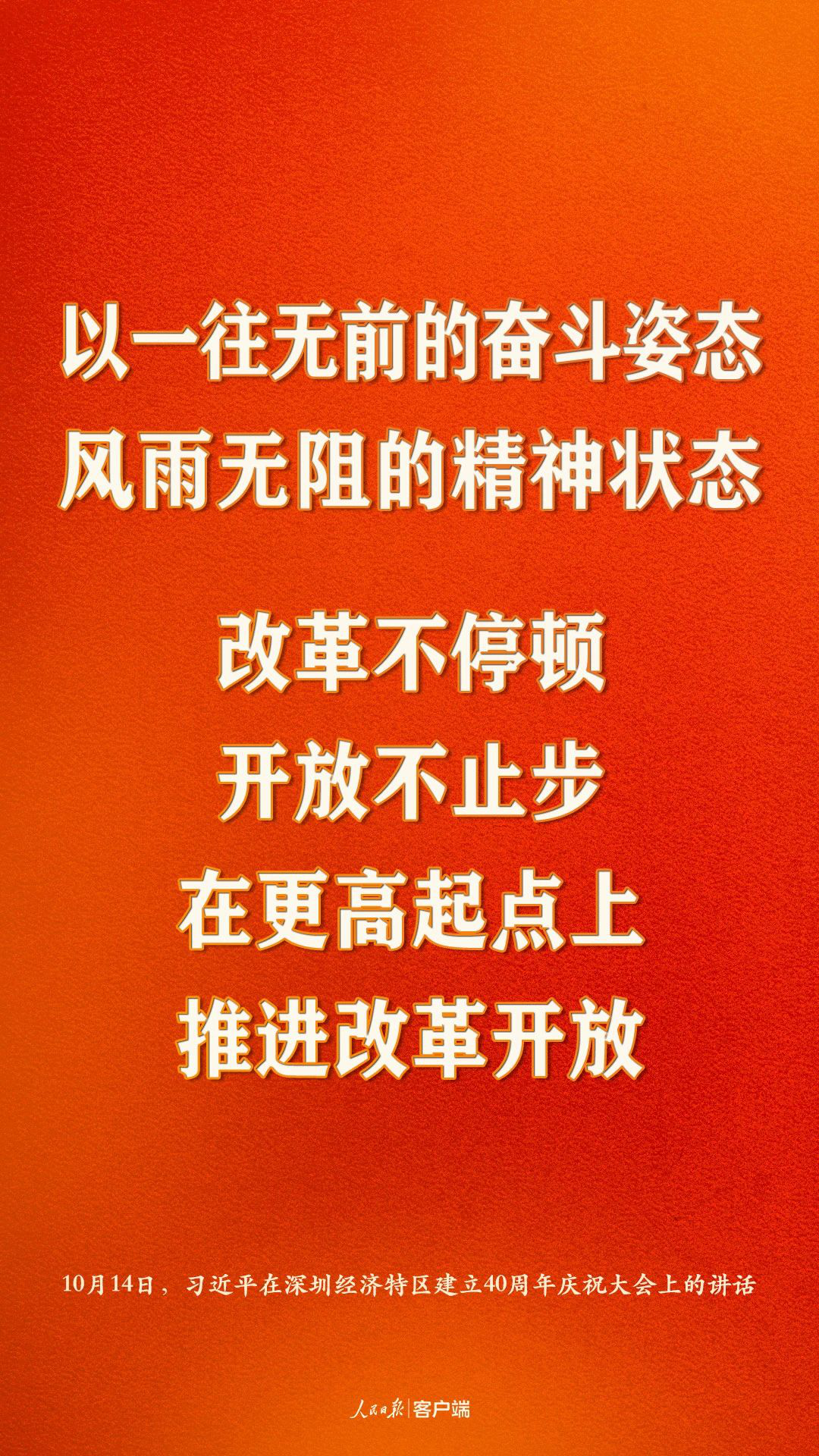 深圳经济特区建立40周年庆祝大会14日上午在广东省深圳市隆重举行。中共中央总书记、国家主席、中央军委主席习近平在会上发表重要讲话,强调要高举中国特色社会主义伟大旗帜,统筹推进“五位一体”总体布局,协调推进“四个全面”战略布局,从我国进入新发展阶段大局出发,落实新发展理念,紧扣推动高质量发展、构建新发展格局,以一往无前的奋斗姿态、风雨无阻的精神状态,改革不停顿,开放不止步,在更高起点上推进改革开放,推动经济特区工作开创新局面,为全面建设社会主义现代化国家、实现第二个百年奋斗目标作出新的更大的贡献。