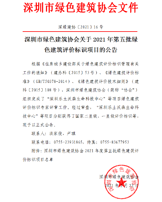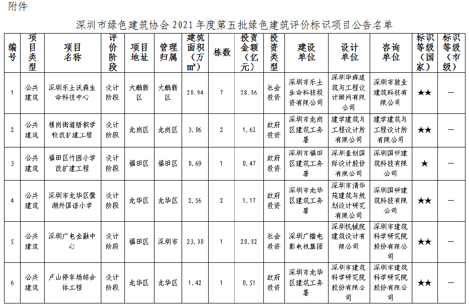 深圳市绿色建筑协会关于2021年第五批绿色建筑评价标识项目的公告