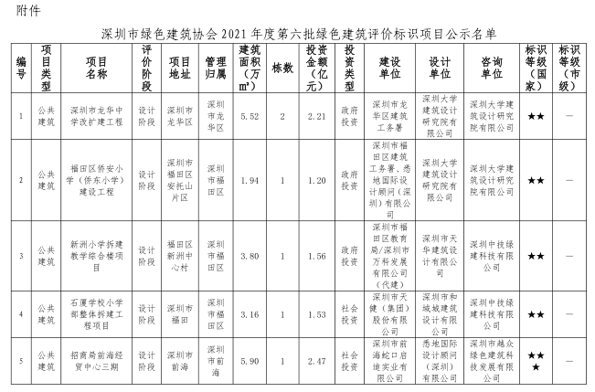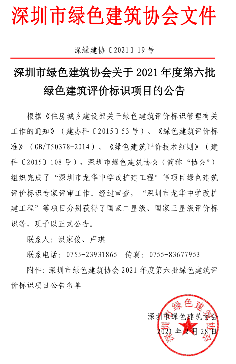 深圳市绿色建筑协会关于2021年第六批绿色建筑评价标识项目的公告