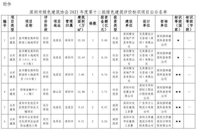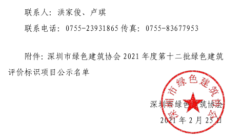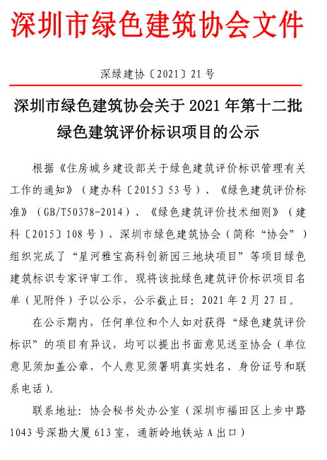 深圳市绿色建筑协会关于2021年第十二批绿色建筑评价标识项目的公示