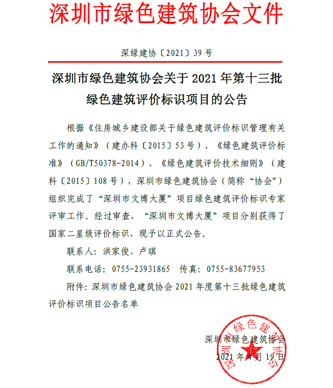 深圳市绿色建筑协会关于2021 年第十三批 绿色建筑评价标识项目的公告