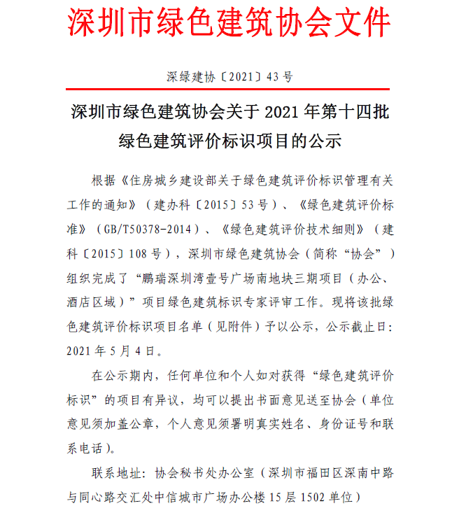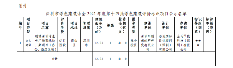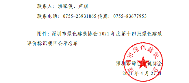 深圳市绿色建筑协会关于2021 年第十四批 绿色建筑评价标识项目的公示