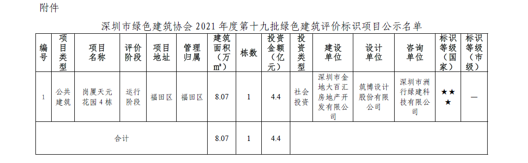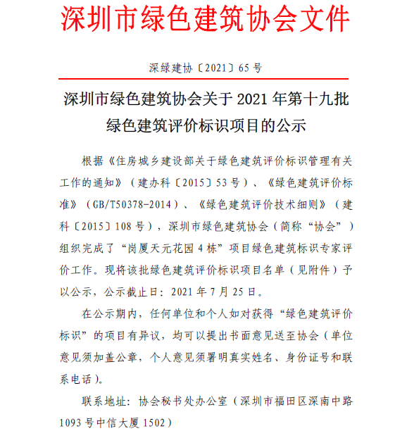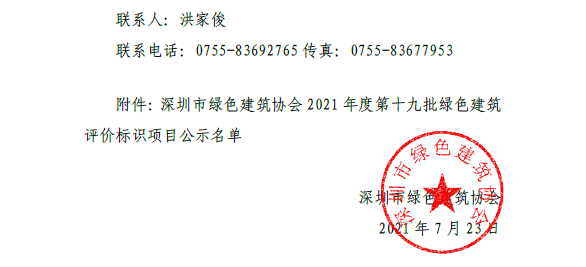 深圳市绿色建筑协会关于2021年第十九批绿色建筑评价标识项目的公示