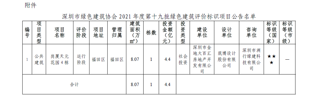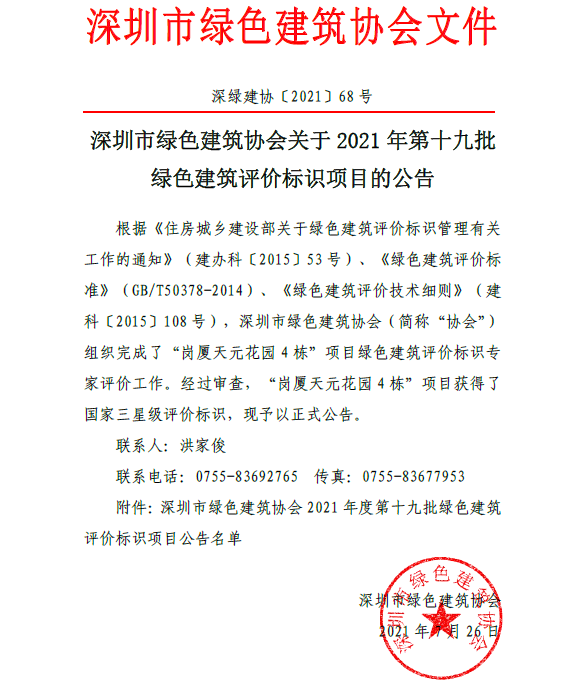 深圳市绿色建筑协会关于2021 年第十九批绿色建筑评价标识项目的公告