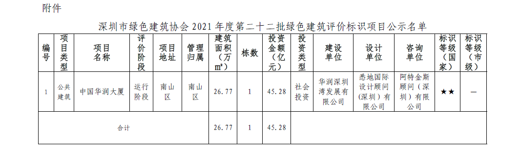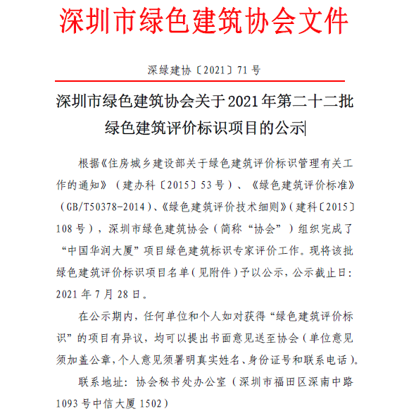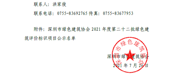 深圳市绿色建筑协会关于2021年第二十二批绿色建筑评价标识项目的公示