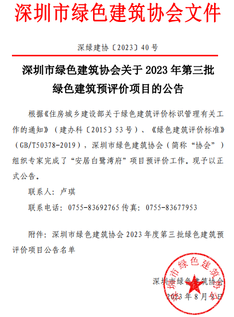 深圳市绿色建筑协会关于2023年第三批绿色建筑预评价标识项目的公告