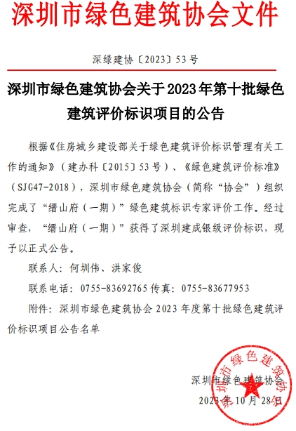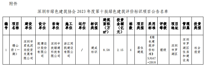 深圳市绿色建筑协会关于2023年第十批绿色建筑评价标识项目的公告