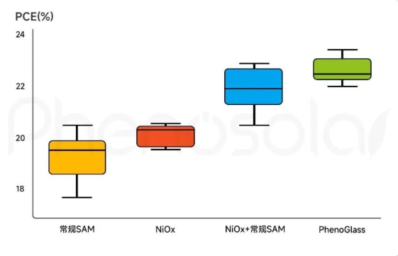 近日,现象光伏发布PhenoGlass®集成基底在300×300mm²标准尺寸下的最新测试成果,其在内部研发及多家客户场景中展现出优异的光电转换效率(PCE%)与一致性;本次测试覆盖常规SAM、NiOx、NiOx+常规SAM、PhenoGlass®四种技术体系,多轮重复测试显示PhenoGlass®批间偏差率极小,既体现了产品高一致性,也验证了预制化界面技术的规模化可复制性;同时其平均效率达22.65%、最高效率突破23.45%,对比常规SAM体系平均绝对效率提升了约3%;对比NiOx+常规SAM体系平均绝对效率提升了约0.7%。