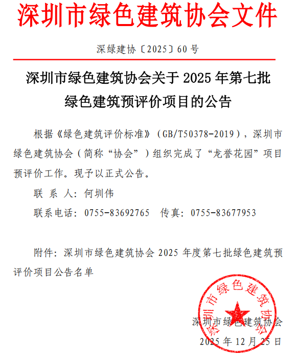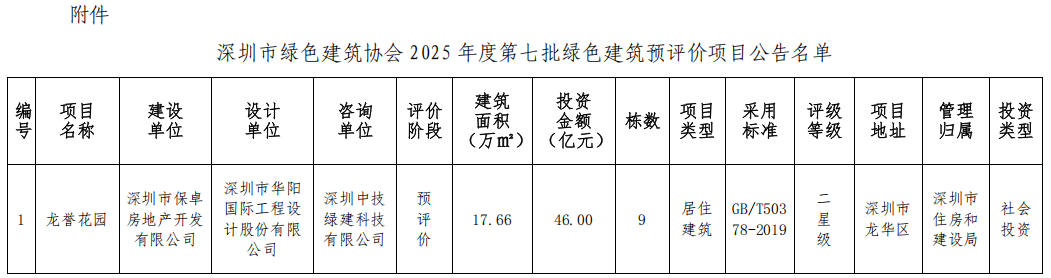 深圳市绿色建筑协会关于2025年第七批绿色建筑预评价项目的公告