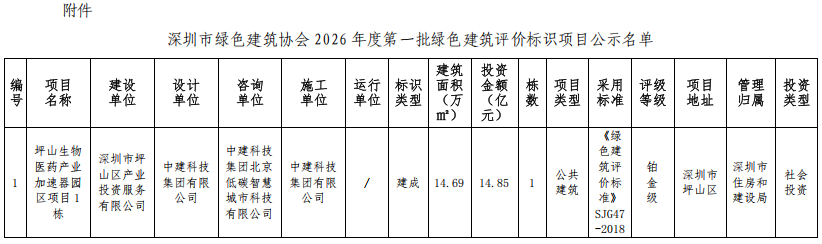深圳市绿色建筑协会关于2026年第一批绿色建筑评价标识项目的公示