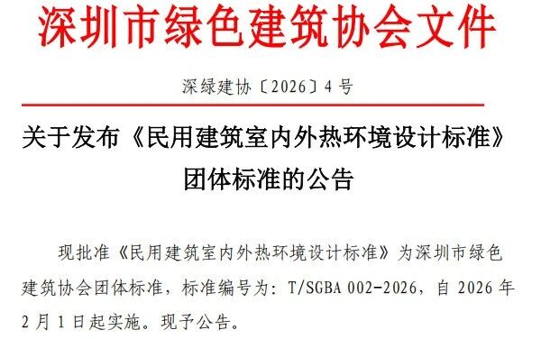 2026年1月5日,深圳市绿色建筑协会团体标准《民用建筑室内外热环境设计标准》(简称《标准》)发布,并于2026年2月1日起正式实施。