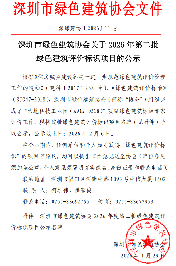 深圳市绿色建筑协会关于2026年第二批绿色建筑评价标识项目的公示