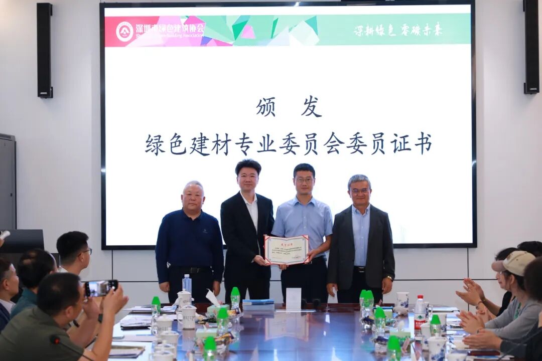绿色建材专业委员会委员证书颁发环节,协会绿色建材专业委员会主任吴康向广东坚朗五金制品股份有限公司深圳分公司总经理昝军伟授予专委会委员证书