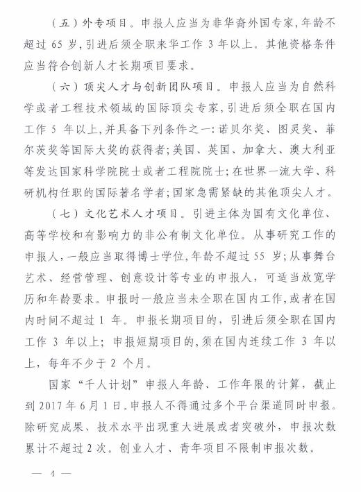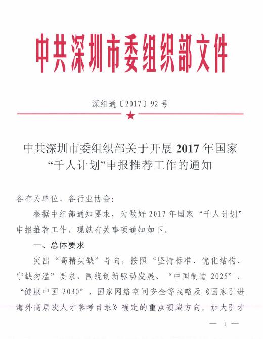 转:中共深圳市委组织部关于开展2017年国家“千人计划“申报推荐工作的通知