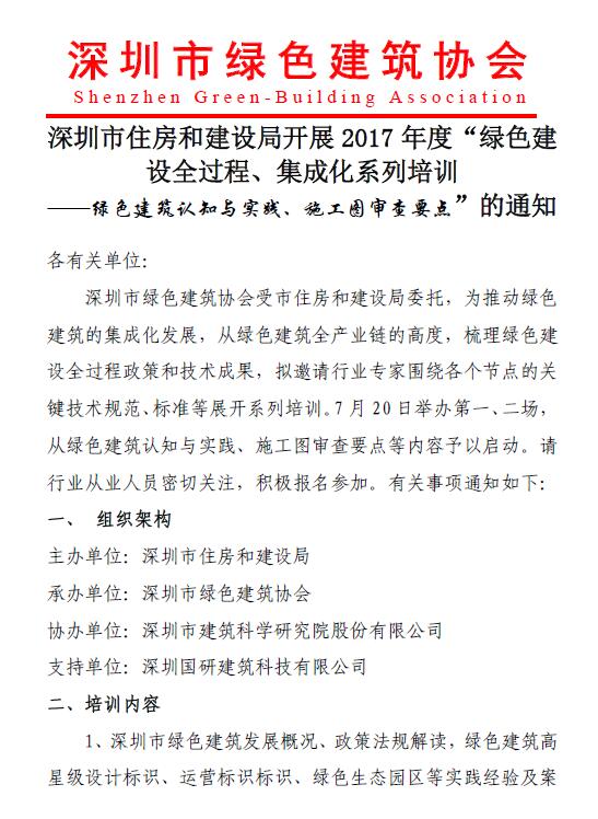 深圳市住房和建设局开展2017年度“绿色建设全过程、集成化系列培训”的通知