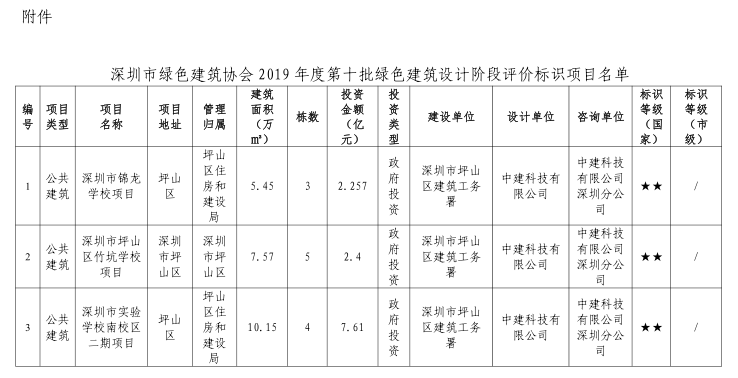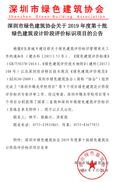 深圳市绿色建筑协会关于2019年度第十批绿色建筑评价标识项目的公告