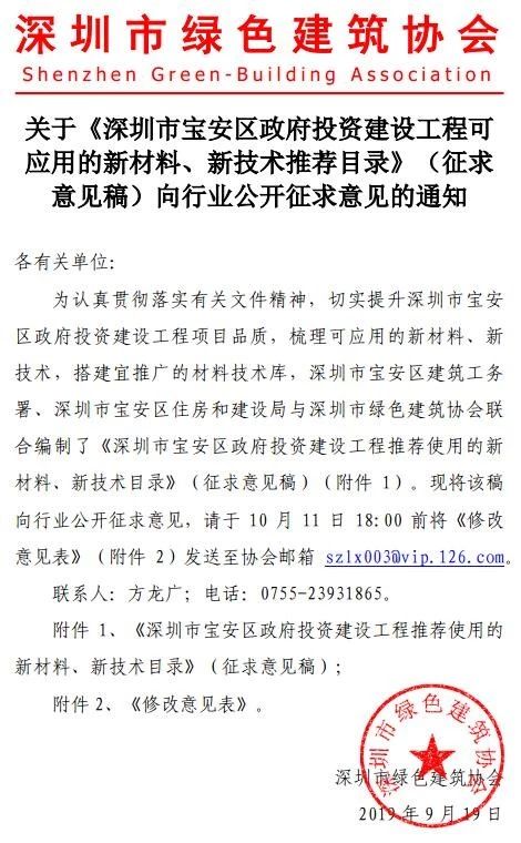 关于《深圳市宝安区政府投资建设工程可应用的新材料、新技术推荐目录》(征求意见稿)向行业公开征求意见的通知