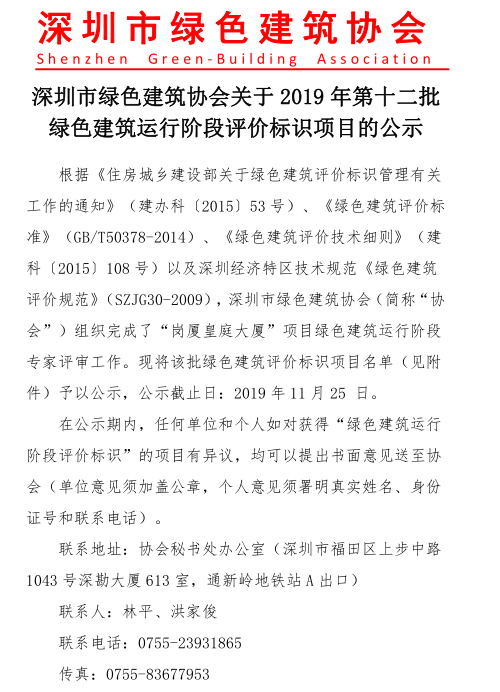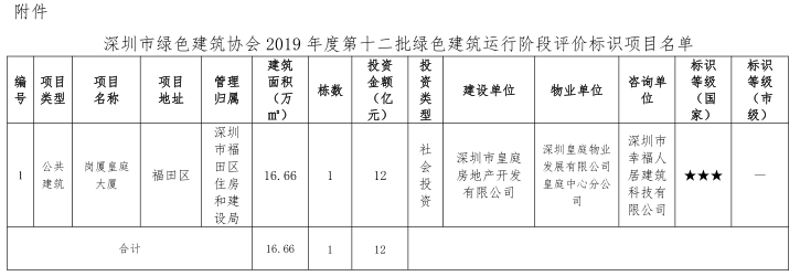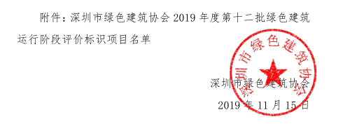深圳市绿色建筑协会关于2019年度第十二批绿色建筑运行阶段评价标识项目的公示